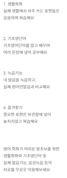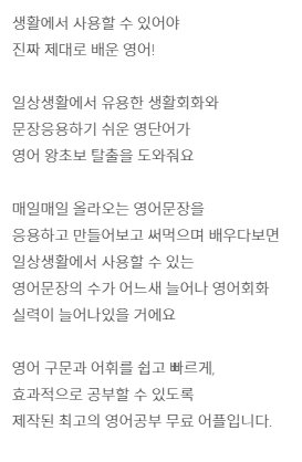 생활에서 사용할 수 있어야 진짜 제대로 배운 영어! 일상생활에서 유용한 생활회화와 문장응용하기 쉬운 영단어가 영어 왕초보 탈출을 도와줘요 매일매일 올라오는 영어문장을 응용하고 만들어보고 써먹으며 배우다보면 일상생활에서 사용할 수 있는 영어문장의 수가 어느새 늘어나 영어회화 실력이 늘어나있을 거에요 영어 구문과 어휘를 쉽고 빠르게, 효과적으로 공부할 수 있도록 제작된 최고의 영어공부 무료 어플입니다. 1. 생활회화 실제 생활에서 자주 쓰는 표현들로 응용하며